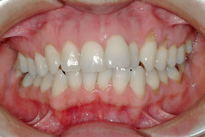上顎の前突感と歯の叢生を気にされて来院された成人の患者さんです。歯の欠損と歯周病の進行なども懸念されましたので、非抜歯で矯正治療を行っております。ただし、上顎の前突ケースを非抜歯で治療を行うために、エッジワイズ装置に先立ち、上顎大臼歯の遠心移動(後方への拡大)を行った後、デーモンシステムに移行いたしました。そのため、かなり長期な矯正治療となってしまいましたが、非抜歯での配列を行えたことは、良かったと思っております。
