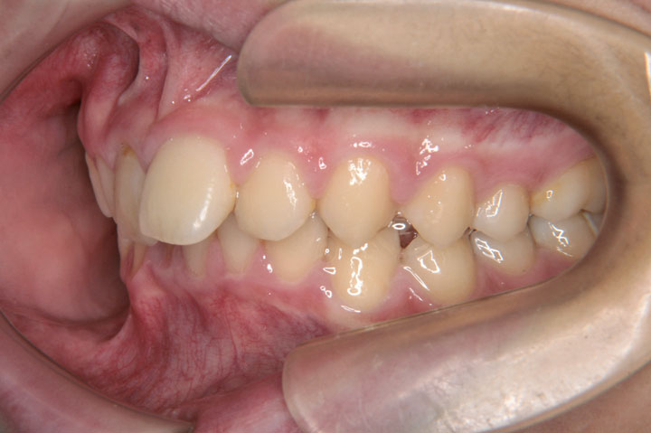 先天性口唇口蓋裂患児で小学校2年生の男子です。前歯部交叉咬合を認め、下顎前歯の歯肉が退縮しダメージの大きい状態でした。そのためリンガルアーチによる前歯部被蓋改善より開始し、その後拡大処置に行っております。上顎右側側切歯が欠損でしたが、ご父兄と相談の結果、反体側の抜歯による無理な正中線の補正はおこなわずエッジワイズ治療に移行しております。またダメージの大きかった下顎前歯の歯肉は回復することができ、良い治療結果であったと思っております。