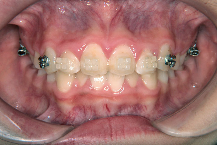 上顎の前突感と歯のデコボコを主訴に来院された小学校4年生の女子です。上顎前突改善のためにヘッドギアーを用い、あわせて歯列拡大のために拡大床、バイヘリックスで前期治療を行っております。その後、セクショナルアーチで前歯配列から開始し上下顎のエッジワイズ治療に移行いたしました。前期治療2年、後期治療2年を要しております。