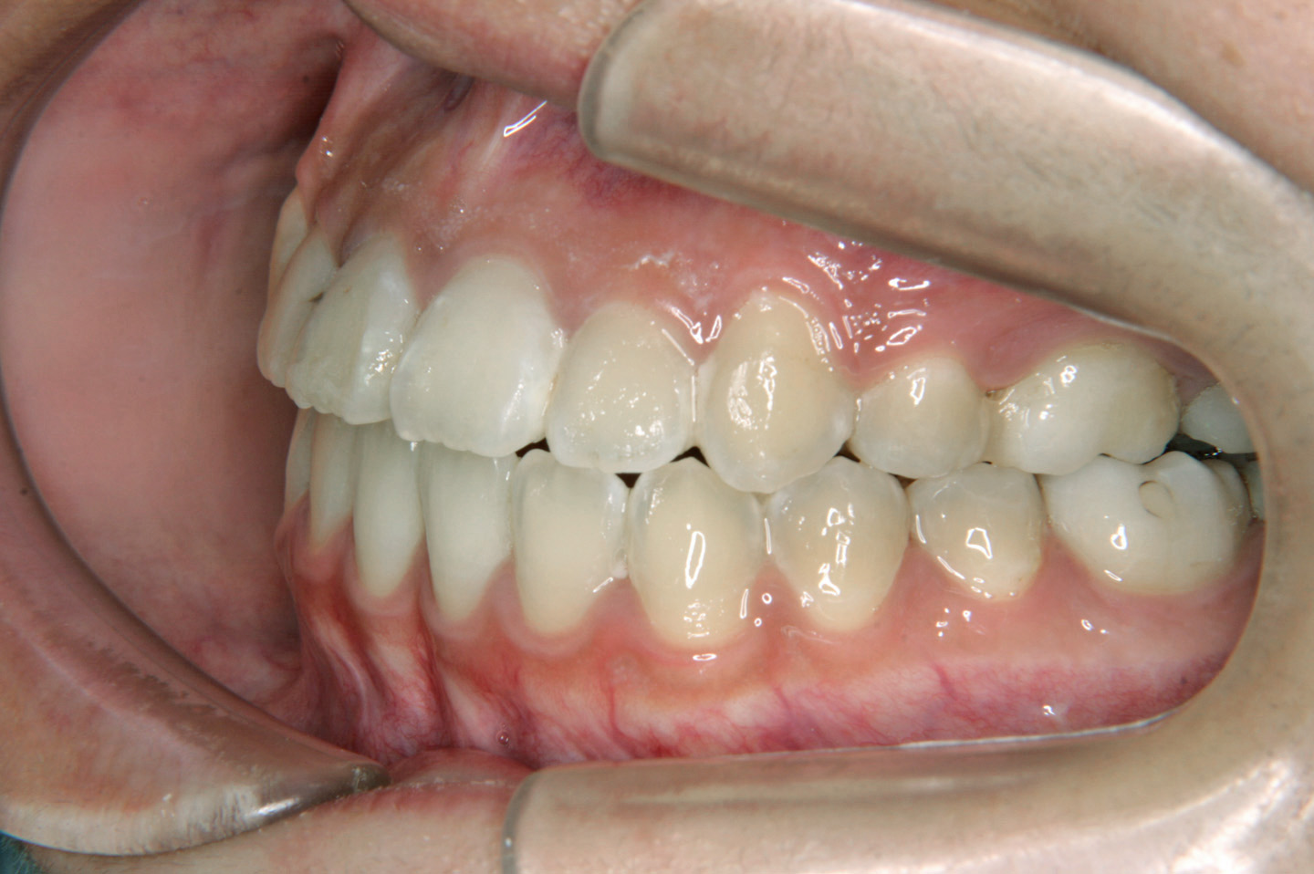 受け口を気にされて来院された女性です。骨格性の重度な受け口であり、下顎が左へずれていたため下顎骨の外科矯正手術を併用してかみ合わせを改善しました。また、上顎は叢生の程度が大きく、上の前歯歯軸が外向きに傾いておりましたので上顎小臼歯を抜歯させていただきました。反対咬合はもちろんですが、良好なプロファイル(側貌)を得ることができました。2年11ヶ月の動的治療を行い、ボンデッドワイヤーとリテーナーを併用した保定に移行いたしております。
